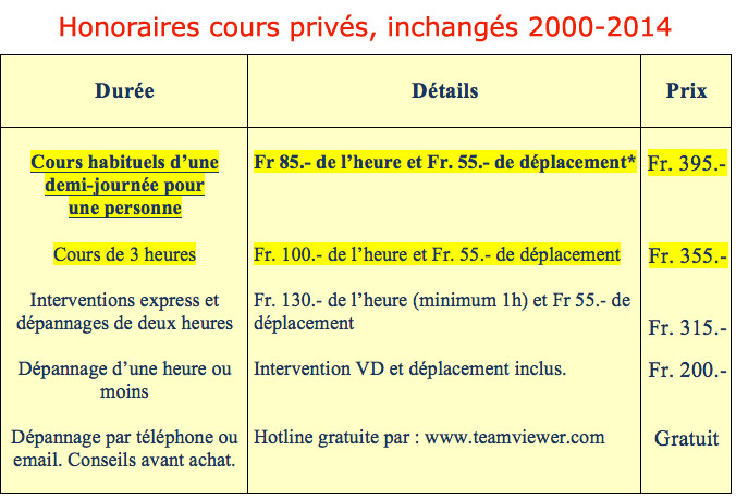Pour 4 heures, qui est le module habituel, les honoraires sont de Fr. 85.- l’heure.